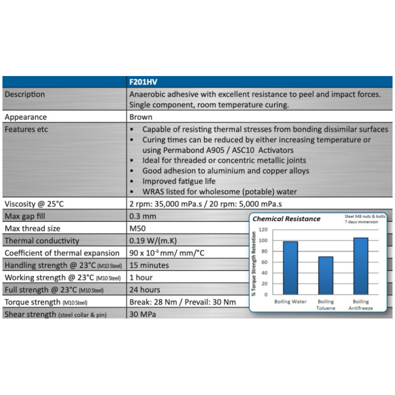Permabond F201HV anaerobic sealant is a high-strength, high-performance engineering adhesive designed for sealing metal pipe joints and it also has